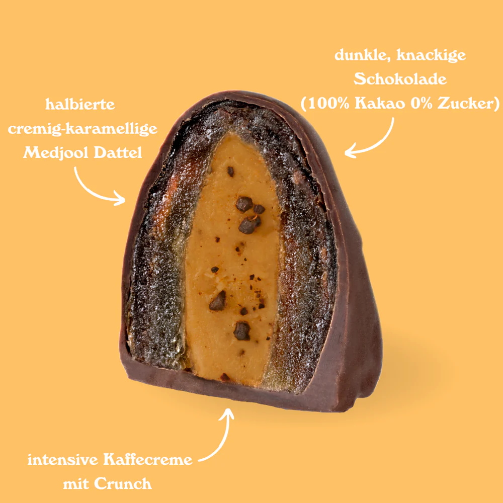Das süße Fruchtfleisch der Medjool-Dattel bildet den perfekten Gegenpart: Es verleiht der Praline eine natürliche Karamellnote und sorgt für ein wunderbar rundes Geschmackserlebnis.