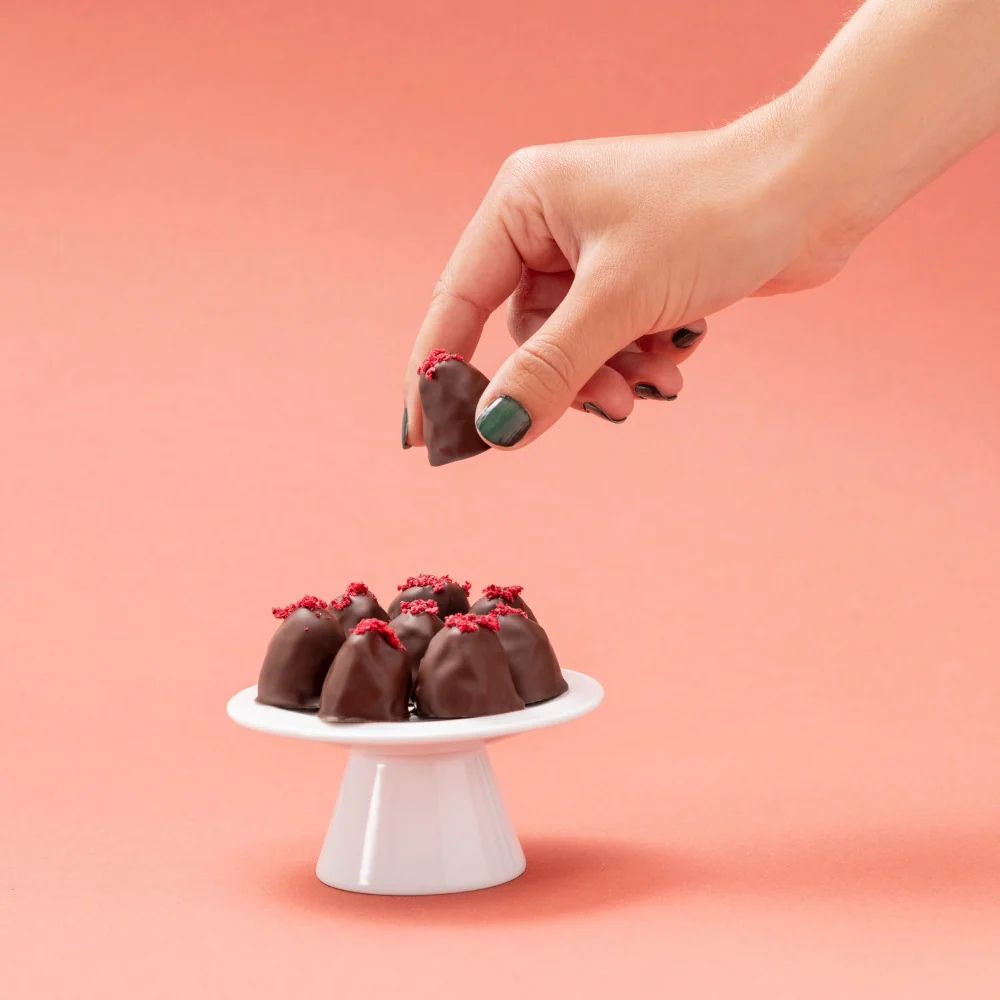 Der Geschmack gefriergetrockneter Himbeeren ist unglaublich aromatisch: tief rot, herrlich fruchtig und mit einer feinen, natürlichen Säure. In Kombination mit unserer extra dunklen Schokolade entsteht eine Füllung, die kaum schöner sein könnte – intensiv, cremig und mit einem spektakulären Farbspiel.