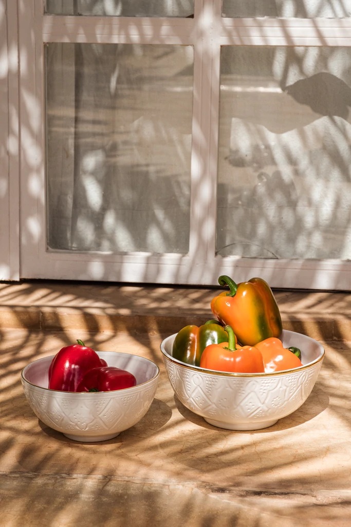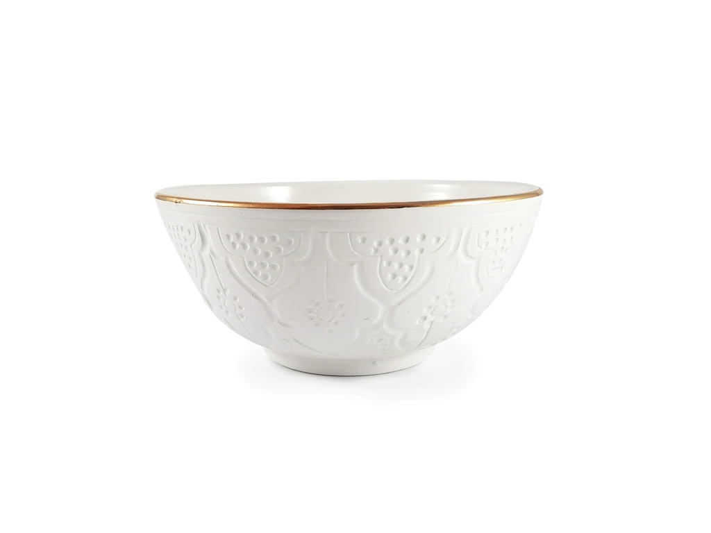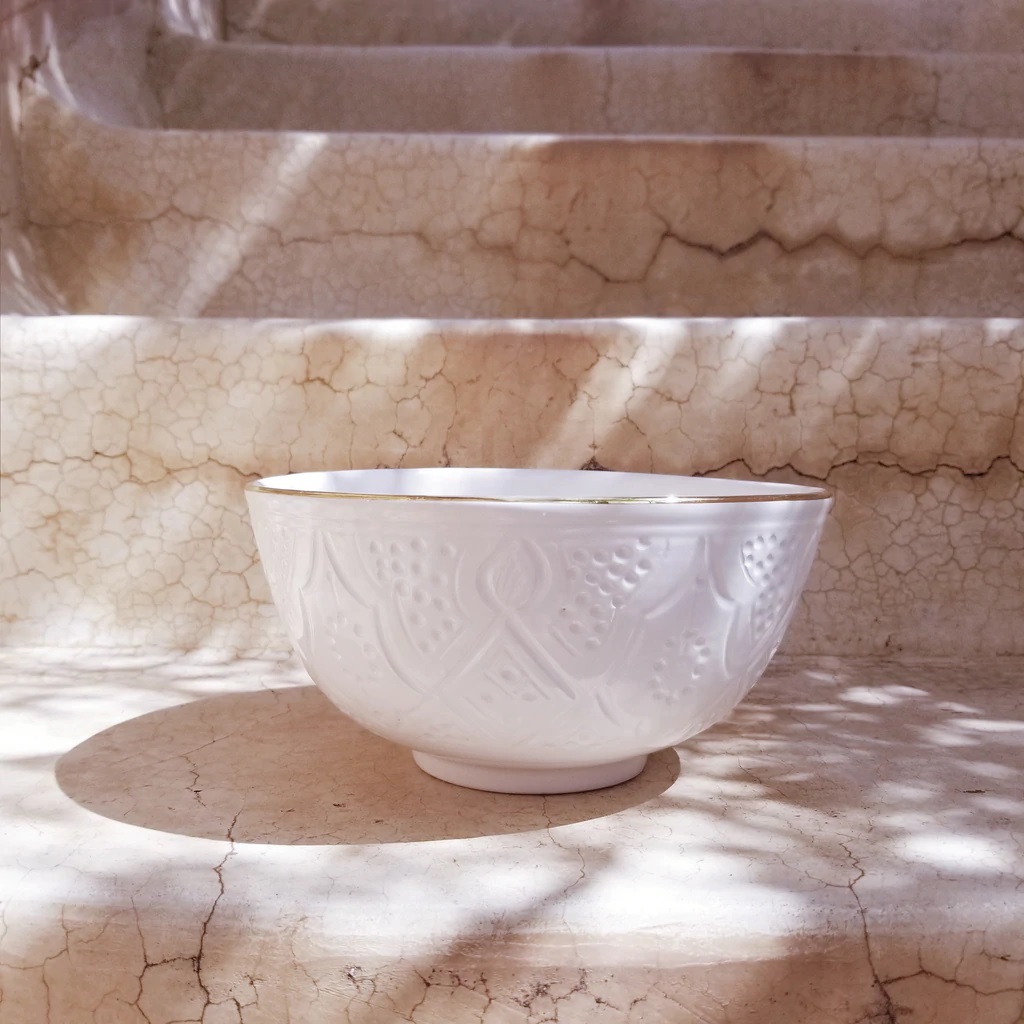 Handgemachte marokkanische Salatschüssel XL graviert mit Goldrand, Weiss D25
