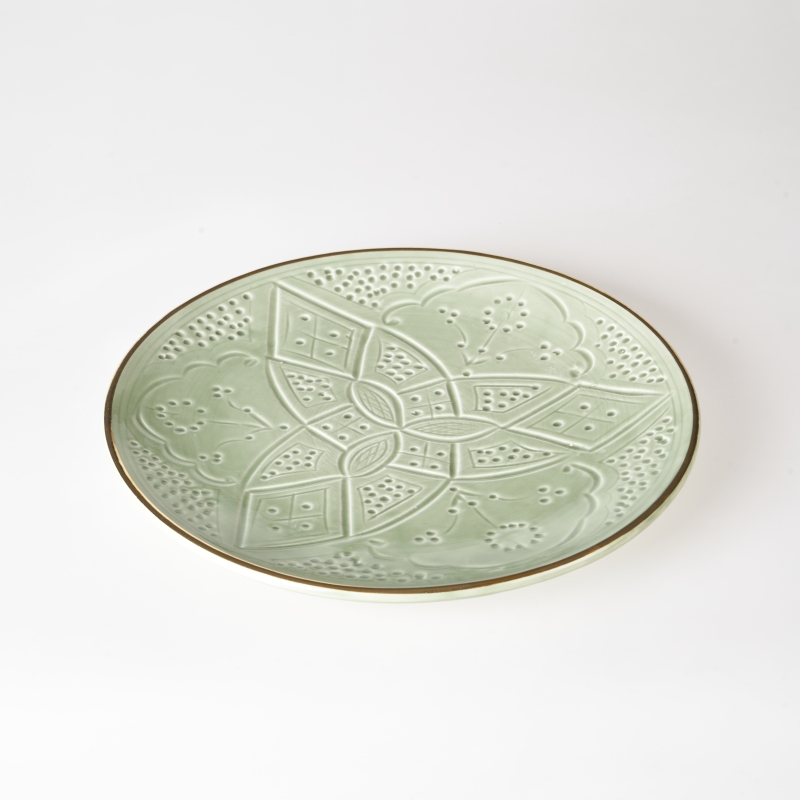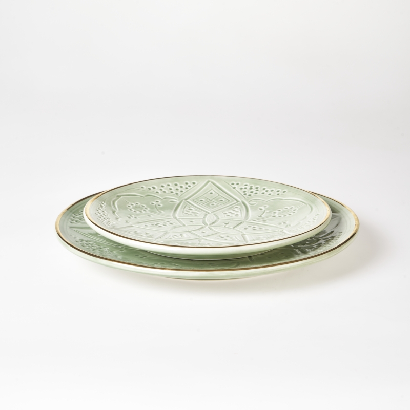 Handgemachter marokkanischer Teller Mandelgrün & Gold GRAVIERT L